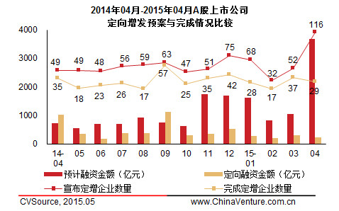 图1 2014年4月至2015年4月A股上市公司定向增发预案与完成情况比较
