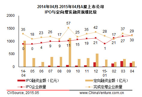 图2 2014年4月至2015年4月A股上市公司IPO与定向增发融资规模比较