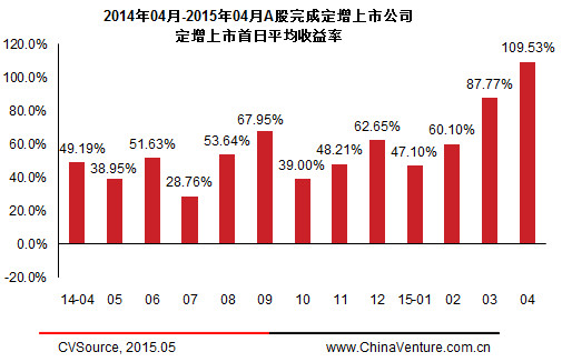 图3 2014年4月至2015年4月A股完成定增上市公司定增上市首日平均收益率