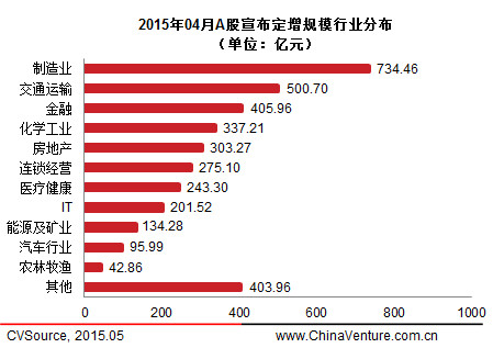从宣布定向增发预案的上市公司所属行业上来看,本月116家宣布定增预案的上市公司主要集中在制造业、IT等行业。根据投中研究院统计显示,2015年4月,共有31家制造业上市公司宣布定增预案,占本月宣布定增上市公司数量的26.72%,预计募集资金734.46亿元(见表5,图4、图5)。
