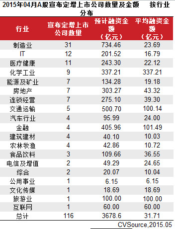 表5 2015年4月A股宣布定增上市公司数量及金额按行业分布