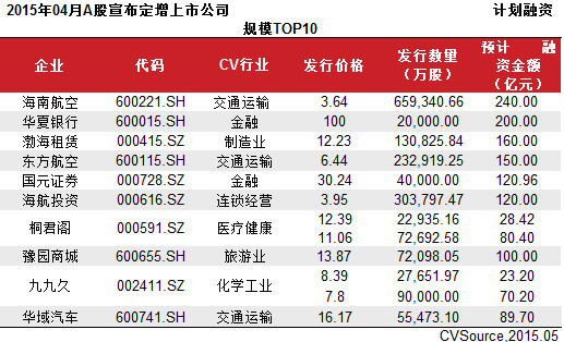 2015年4月,在发布定增预案的企业中,海南航空(600221.SH)向包括海航航空集团在内的不超过 10 名特定对象非公开发行的股票数量不超过6,593,406,593股,发行价格不低于3.64元/股,募集资金总额不超过240亿元,海航航空集团等发行对象均以现金认购此次发行的海南航空的股票,为本月宣布定增规模最大案例(见表1)。
