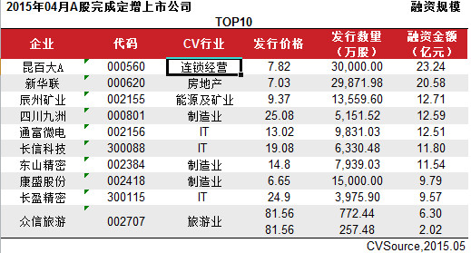 2015年4月,在已经实施定向增发的上市公司中,昆百大A(000560.SZ)发行股份300,000,000股,发行价格7.82元/股,募集资金总额2,323,750,000.00元,在本月已经实施定增的上市公司中融资规模居首位(见表2)。