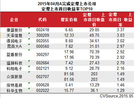 表3 2015年4月A股完成定增上市公司定增上市首日收益率TOP10