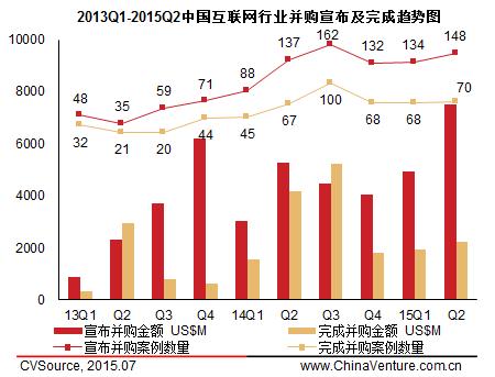图3 2013Q1-2015Q2中国互联网行业并购宣布及完成趋势图