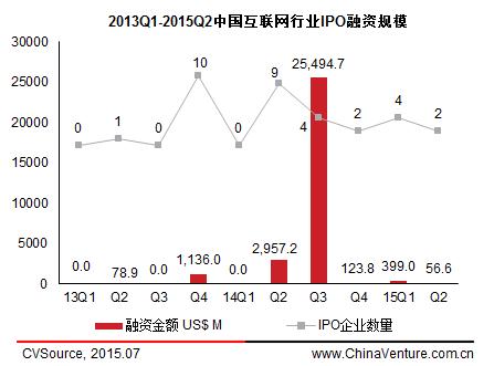 2015年二季度互联网行业上市事件仅发生2起,环比下降50%,募集资金0.57亿美元,环比下降85.81%(见图4)。