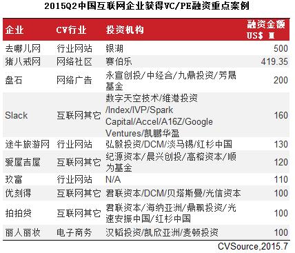 表1 2015Q2中国互联网企业获得VC/PE融资重点案例