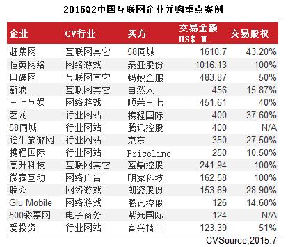 从具体案例看,本季度互联网企业收购事件涉及金额超过1亿美元的共有15起(见表2)。收购金额位居榜首的是4月17日宣布的58同城收购赶集网43.2%股份,交易金额16.11亿美元。58同城和赶集网作为目前中国两家最的大分类信息网站,在相互竞争的过程中都越来越强大,二者的合并不仅减少了营销成本,还扩大了平台优势,更促进了资源优势互补,为用户提供更好的服务。4月16日宣布的泰亚鞋业股份有限公司(002517.SZ)将其全部资产和负债与上海恺英网络科技有限公司100%股权中的等值部分进行置换,涉及金额10.16亿美元,构成借壳上市,本事件在2015年二季度并购事件发生规模中位列第二。