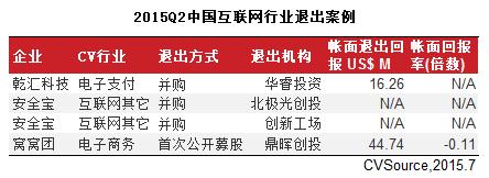 在退出方面,2015年二季度互联网行业涉及退出事件仅4起。其中,窝窝团上市,鼎晖创投实现退出;而另外3起均为并购退出(见表4)。