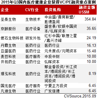 表1 2015年Q3国内医疗健康企业获得VC/PE融资重点案例