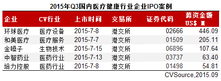 表3 2015年Q3国内医疗健康行业企业IPO案例