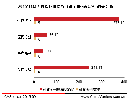 图2 2015Q3国内医疗健康行业细分领域VC/PE融资分布