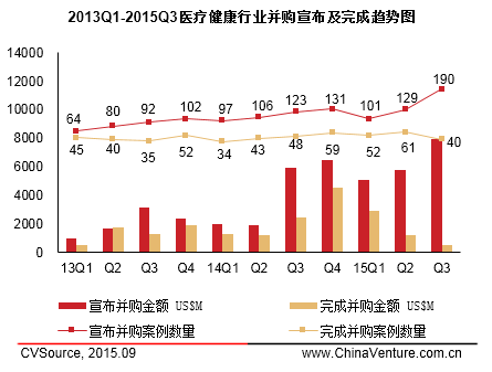图3 2013Q1-2015Q3中国医疗健康并购宣布及完成趋势图