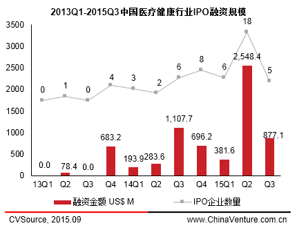 图4 2013Q1-2015Q3中国医疗健康行业IPO融资趋规模