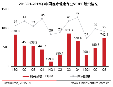 图1 2013Q1-2015Q3中国医疗健康行业VC/PE融资情况
