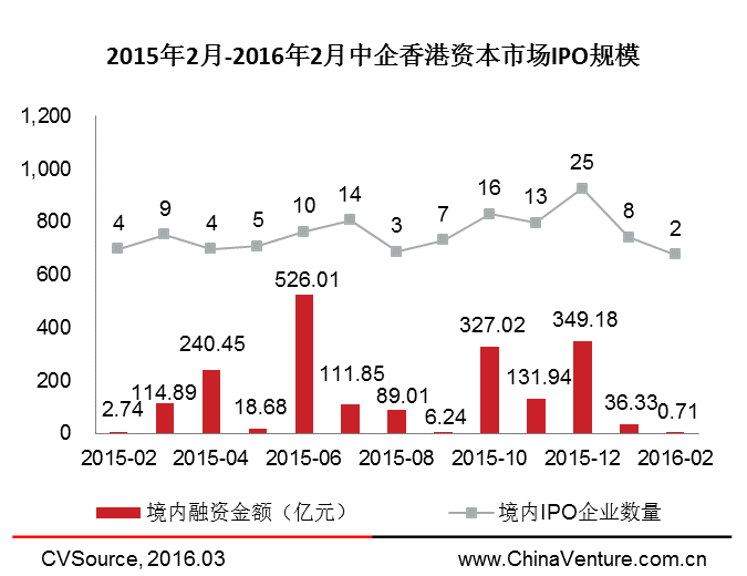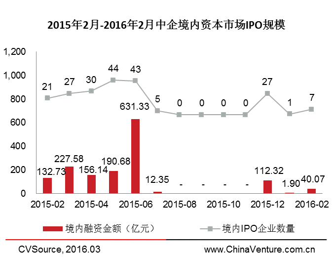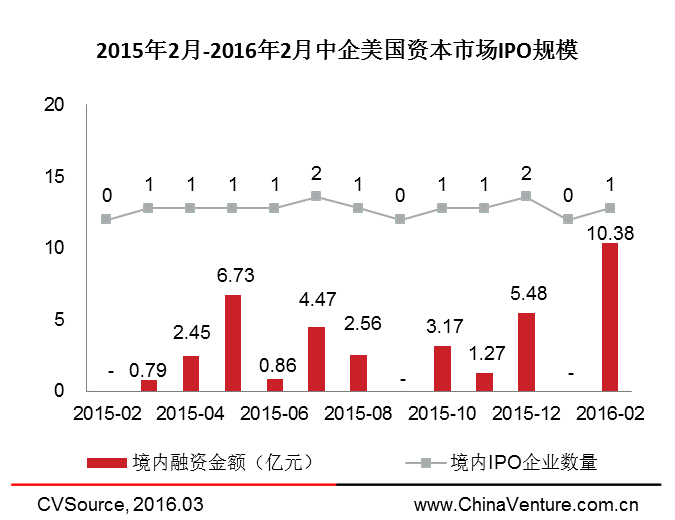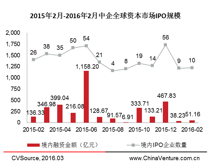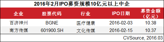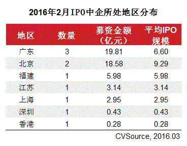2016年2月,共10家中企完成IPO,环比上升11.11%;募集资金51.16亿元,环比上升33.82%。