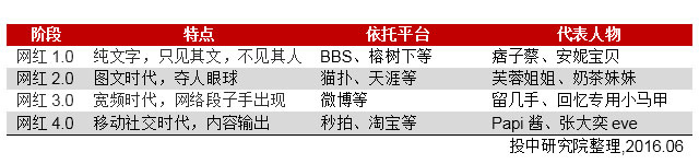 与美国网红主要是针对优质内容升级的发展历程有些不同的是,投中研究院认为,中国的网红更多随着互联网的发展而不断更迭的。