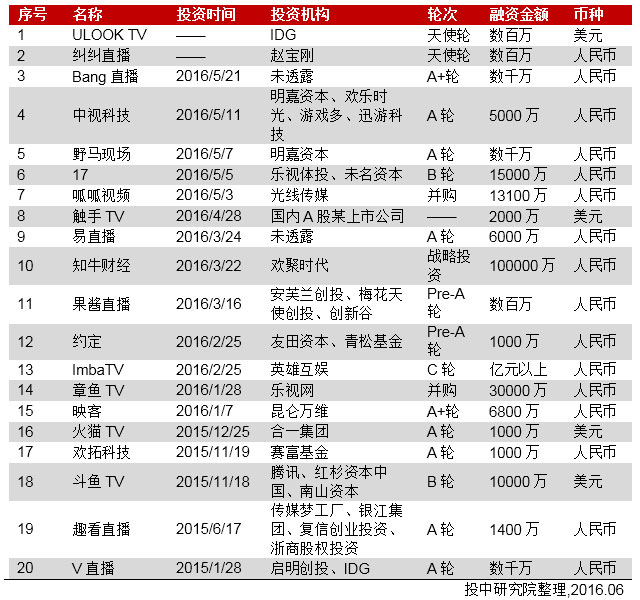 根据投中研究院的统计,目前约有53.7%的直播平台获得融资,直播平台以一种掩耳不及迅雷之势成为资本市场争相追逐的热点。如17获得乐视体投、未名资本1.5亿元的B轮融资;果酱直播获得安芙兰创投、梅花天使创投、创新谷数百万元Pre-A轮融资;映客也在2016年1月获得昆仑万维6800万元的A+轮融资等。同时一些大型企业也推出直播平台,如360推出花椒直播、网易推出BOBO直播、秒拍推出一直播等。