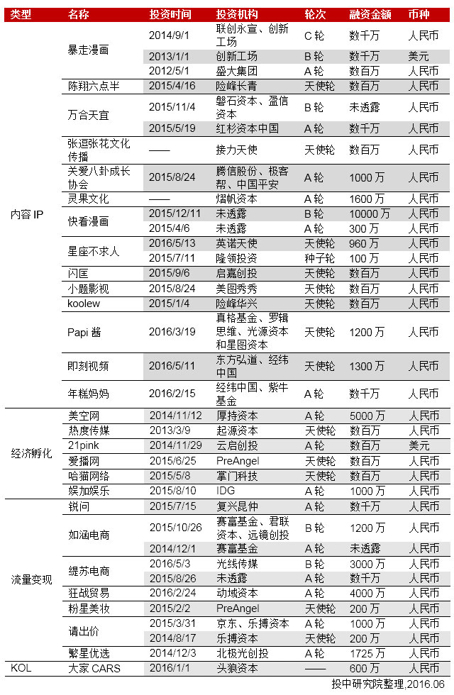 投中研究院发现,目前投资机构认为单个网红没有什么投资价值,因为人们是喜新厌旧的,追求的是新鲜感,单个网红很难持续生产出新鲜的东西。而且投资单个网红的风险相对较大,这种风险一方面来自于网红的人身健康风险,另一方面来自于道德风险,单个网红可能会因为一些言论或思想而被封杀。