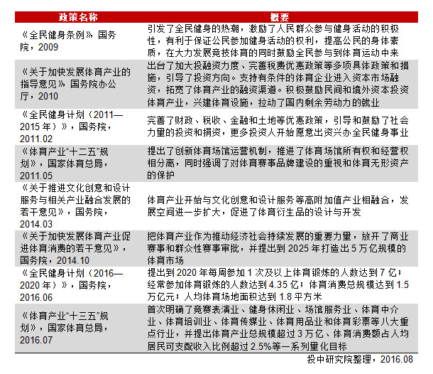 2014年10月,国务院发布了《关于加快发展体育产业促进体育消费的若干意见》(以下简称“46号文”),提出要把体育产业作为推动经济社会持续发展的重要力量,开发体育产业巨大的潜在市场空间,利用体育产业扩内需、促消费,放开了商业赛事和群众性赛事审批,并制定了2025年打造出5万亿规模的体育市场的目标。