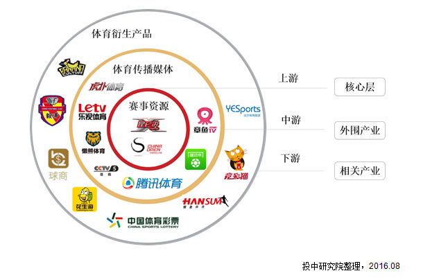 从宏观产业角度看,体育行业可以分为核心层、外围层和相关产业层,分别对应着体育行业产业链的上、中、下游,上游为赛事资源、中游为传播媒体、下游为体育衍生产业(见图1)。