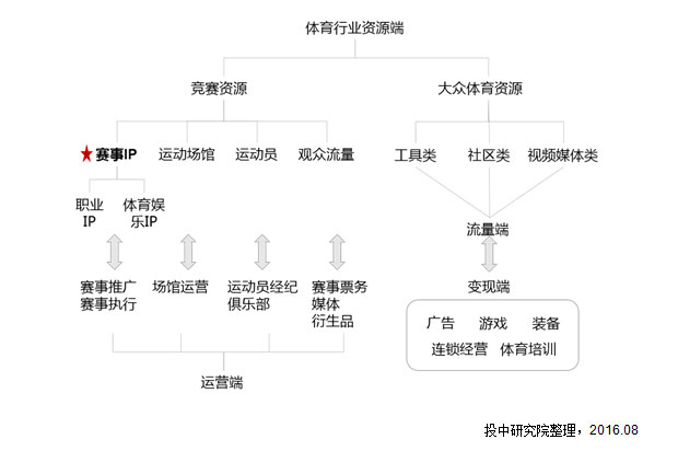 从投资角度看,体育行业在资源端可以分为竞赛表演资源和大众体育资源两大类(见图2)。其中竞赛表演资源又可进一步细分为:赛事IP资源、场馆资源、运动员资源和观众流量资源。