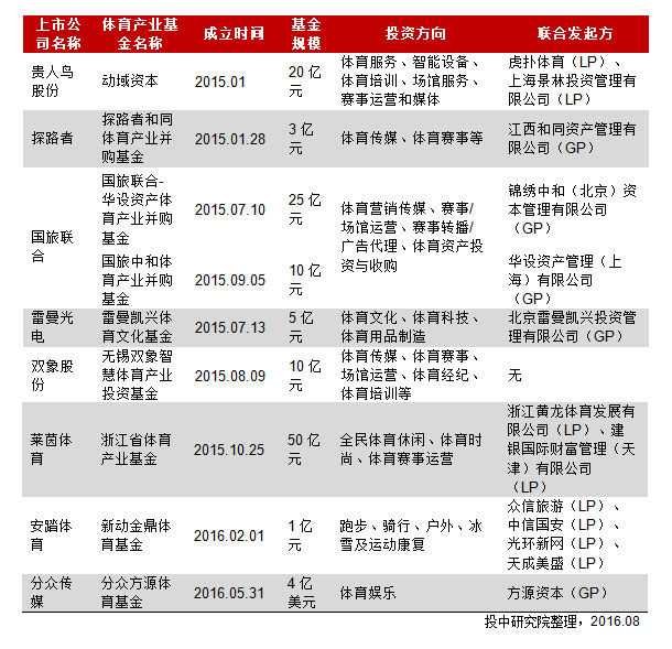 2015年以来,由上市公司发起设立了多支体育产业基金(详见表2),通过投资新型体育产业标的,与上市公司旧有资源形成互动,在整个体育产业链上拓展布局,有利于自身的战略转型。