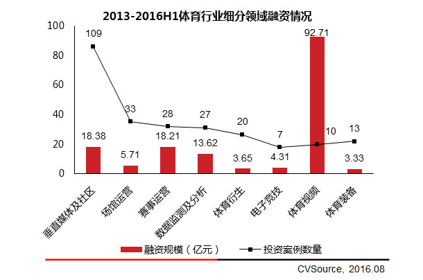 从体育行业细分领域看,根据投中信息数据终端CVSource统计显示,2013年-2016年上半年期间,融资案例数量最多的是垂直媒体及社区,占全行业的44%,垂直媒体及社区拥有稳定的粉丝群体和多种流量变现方式,未来可转型为电商平台(如KEEP于2016年4月推出装备购买版块,试水电商模式)或利用平台资源开展大客户整合营销(如体育自媒体 “杨毅侃球”为匹克做的一系列营销推广活动),还可发展会员组织线下活动(如敢玩Idare推出的系列娱乐、赛事活动);其次是场馆运营和赛事运营,分别占14%和11%,这也是投资人最为关注的三大领域。而在融资规模上,排名第一的是体育视频,融资规模约为92.71亿,其中乐视体育于2016年4月12日完成了80亿的B轮融资,在体育赛事、智能装备、游戏、彩票等方面全面发力,欲打造覆盖“赛事运营+内容平台+智能化+增值服务”全产业链的新型商业模式。