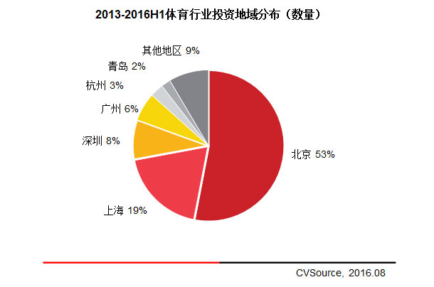 从地域分布来看,根据投中信息数据终端CVSource统计显示,2013年-2016年上半年期间,体育行业融资案例集中在北、上、广、深,其中数量最多的城市是北京,占比超过全国一半以上,总数为131起,上海、深圳位列第二、第三,占比分别为19%和8%,广州紧随其后,占比为6%,此外杭州占比3%,青岛占比2%,其他地区共占比9%。