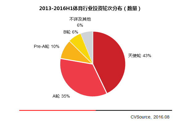 从轮次分布来看,根据投中信息数据终端CVSource统计显示,2013年-2016年上半年期间,体育融资案例主要集中在天使轮和A轮阶段,这两轮投资案例数量合计占比为78%,A轮以后的项目仅占12%,目前成熟项目较少,整个行业发展还处在早期阶段,存在较大成长空间。