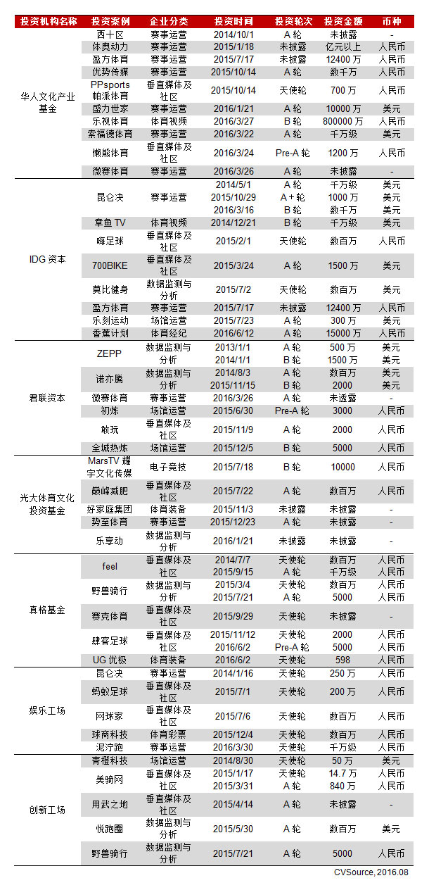 表3 2013- 2016H1体育行业VC/PE活跃机构重点投资案例