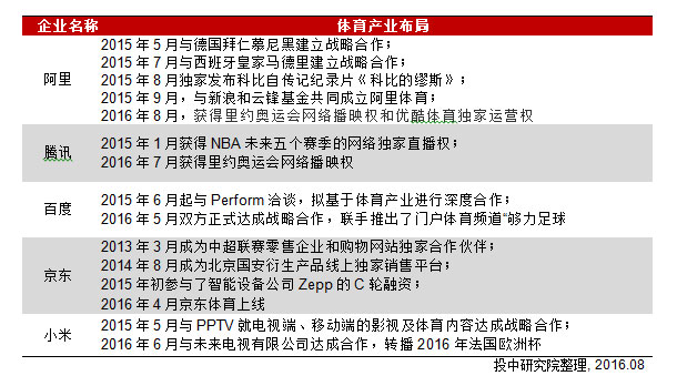 阿里凭借自身电商和大数据平台,布局体育有其先天优势。前期主要将切入点放在产业下游,利用“粉丝经济”快速切入,选择全球有影响力的俱乐部和明星进行合作,投资拥有赛事版权的体育公司,如先后于2015年5月、7月与豪门俱乐部德国拜仁慕尼黑、西班牙皇家马德里建立战略合作;2015年8月在天猫魔盒独家发布篮球巨星科比自传记纪录片《科比的缪斯》等。2015年9月8日,由阿里巴巴、新浪和云锋基金共同成立了阿里体育,未来可通过版权、体育媒体、赛事运营和票务,将电商平台应用在体育产业当中。2016年8月2日,阿里体育宣布获得了里约奥运会网络播映权和优酷体育独家运营权,标志着阿里体育正式进入视频媒体阵营。