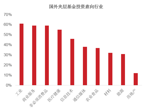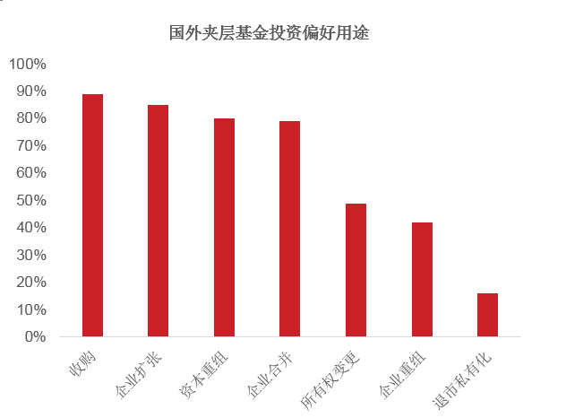 投资方面,海外夹层基金投资偏好于传统行业,据统计,61%的夹层基金投资于工业,其次是商业和服务业、医疗健康产业。能源和房地产业是投资较少的领域,仅有不到30%的夹层基金对能源业和房地产业具有偏好。从投资的目的上分析,接近90%的夹层基金关注于企业收购领域,接下来是企业扩张和企业合并,选择作为退市私有化用途的夹层基金仅有16%。行业和投资目的的两项数据表明,海外夹层基金依旧着力于传统行业的产能扩张和资本重组,这和夹层基金最初的投资用途--为杠杆收购提供资金具有内在的一致性。从投资的回报和风险维度衡量,夹层基金和直接贷款、母基金的风险收益水平相当,在收益上低于次级贷款和私募基金,是一种收益稳健的投资工具。