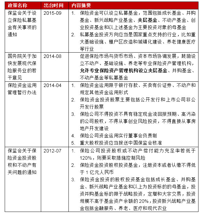 虽然有很多地方有待完善,但夹层基金仍旧是一个具有投资潜力的领域。由于房地产业融资渠道有限、国内基建投资需求旺盛、并购贷款制度不完善等因素的作用,国内投资机构对夹层基金在地产、基建和并购领域运作的前景持续看好。按照保监会2014年《关于加强和改进保险资金运用比例监管的通知》,保险资金运用于权益类资产投资比重不得超过30%,理论上目前保险资金投资夹层基金的上限可达到38486亿元。根据2014年的《国务院关于加快发展现代保险服务业的若干意见》(简写为《国十条》,下文同)中第十四条明确指出:“允许专业保险资产管理机构设立夹层基金。并购基金、不动产基金等私募基金”。这一意见的出台加快了保险资金投资夹层基金的步伐。除《国十条》外,目前保险领域和夹层基金相关政策参见下表: