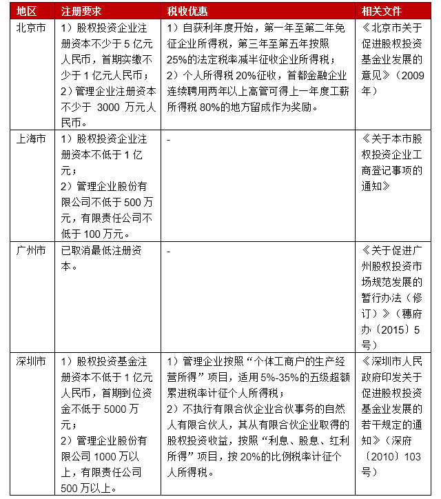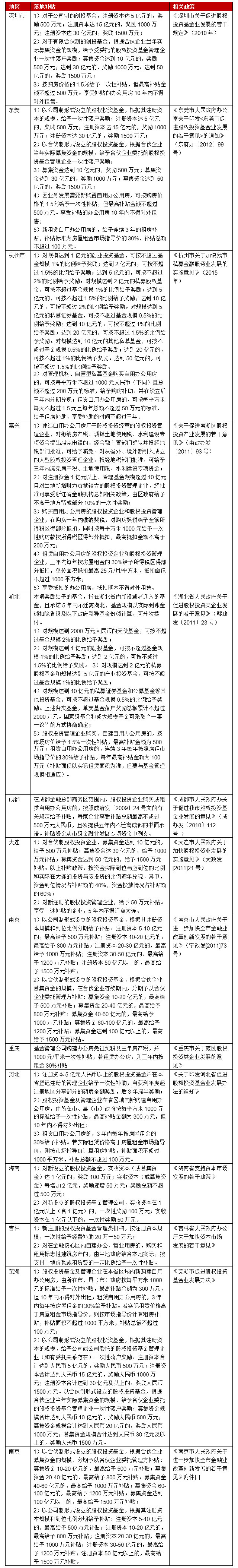 国家和地方层面纷纷推出促进股权投资落地的优惠政策,常见的包括:入驻奖励、投资项目奖励、税收返还等。