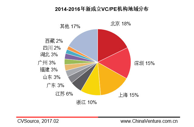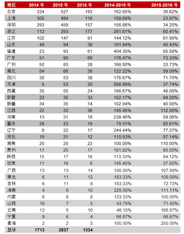 根据投中信息旗下金融数据产品CVSource统计显示,2014年到2016年3年间,国内新成立5884家VC/PE机构,其中北京、深圳、上海、浙江、江苏5和地区落地机构排名靠前,机构数量分别为1044、909、905、582、304家,占比分别为18%、15%、15%、10%、6%,累计达64%。2016年机构成立数量明显低于2015年,北京、上海、深圳、广州变化尤为明显。机构注册数量排名前10的地区,浙江和福建在3年中增速提升最大。其余省市之中,天津、海南、青海、辽宁等地增速提升最大,而山西、宁夏、新疆、重庆等地增速提升最小。