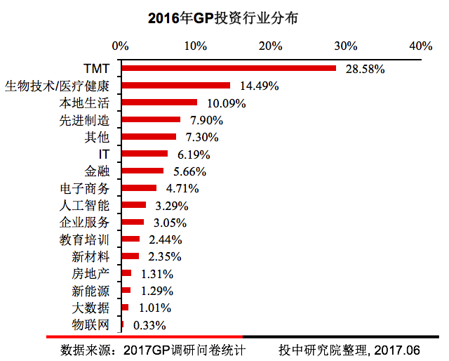 调研数据显示,2016年GP投资最多的行业依次是TMT、生物技术/医疗健康、本地生活、先进制造IT等领域,分别占比28.58%、14.49%、10.09%、7.90%、6.19%。