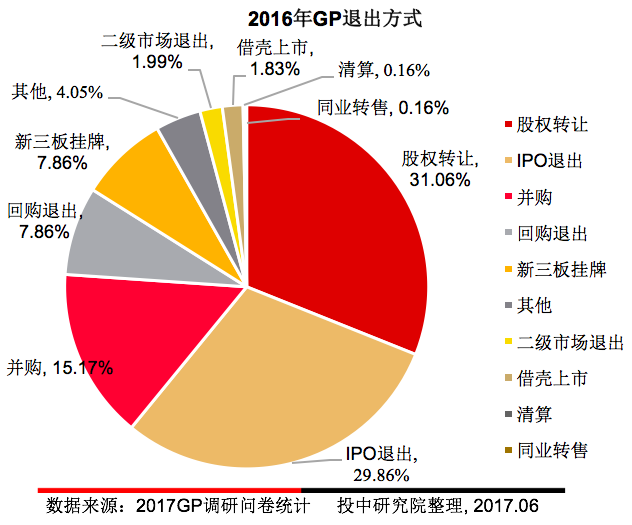 调研数据显示,2016年VC/PE机构的退出方式主要还是以股权转让、IPO、并购退出、回购退出、新三板挂牌退出为主。投中研究院认为,这也是市场上目前主流的退出方式。