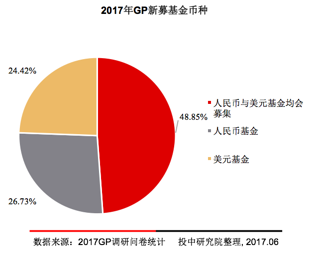 调研结果表明,人民币基金依旧是GP新募基金首选,但是募集美元基金的比例相较于去年有所上升,2016年7%的受访机构计划募集美元基金,而今年是24.42%。投中研究院认为,原因可能是因为自2016年11月底以来,中国人民银行、国家外汇管理局、国家发展和改革委员会、商务部等监管部门接连公开表态要求防范对外投资风险,人民币境外投资受到严格管制,导致募集美元基金的比例上升。但是据1季度投中统计来看,人民币基金仍占有绝对主导。