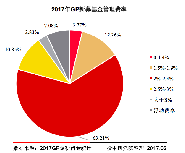 调研结果表明,63.21%的受访机构新募基金管理费率在2%-2.4%之间,12.26%的受访机构新募基金管理费率在1.5%-1.9%之间,10.85%的受访机构新募基金管理费率在2.5%-3%之间。