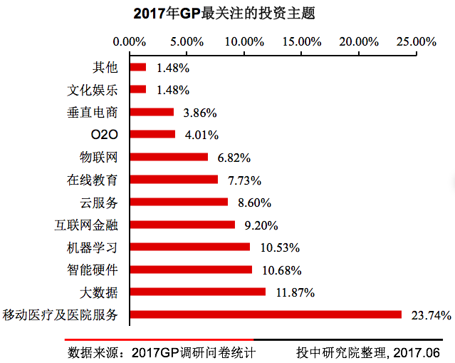 调研结果显示,移动医疗及医院服务、大数据、智能硬件、机器学习等是GP最关注的投资主题,其中移动医疗及医院服务是投资人最为关注的领域。