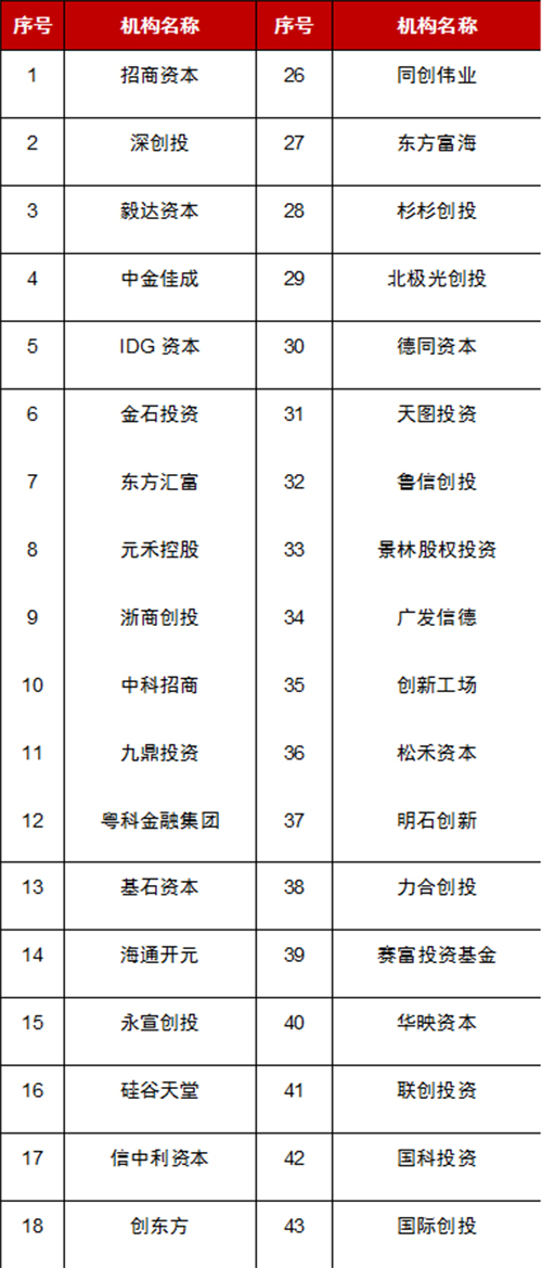 中国创投发展指数通过量化投资机构的募资能力、投资能力、管理能力、退出能力和责任投资五个维度进行筛选出50家具有代表性的创投机构。入选机构需同时遵循以下条件: