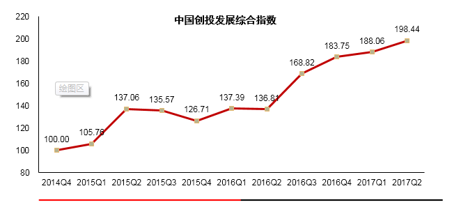 中国创投发展综合指数呈现逐年螺旋式上升的趋势,2017年Q2指数达198.44,创指数新高。指数显示:从2014年国家推出双创政策以来,虽然创投行业受各种因素影响具有一定起伏和波动性,但中国创投行业整体呈现稳步向上发展态势。
