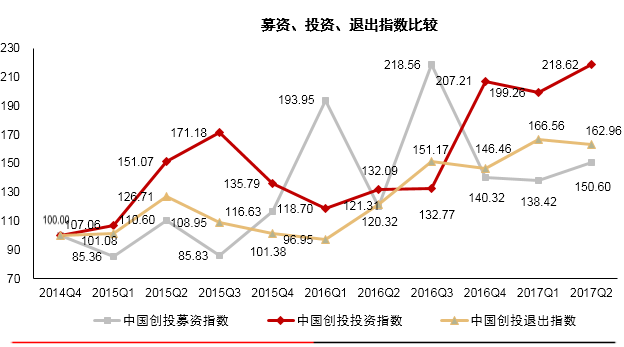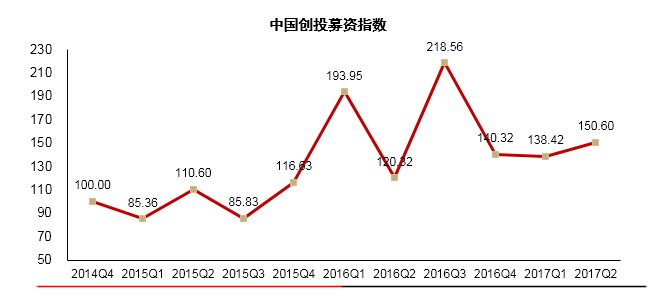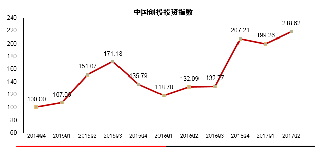 投资指数显示:创投行业在2015年“双创”政策的推动下,投资指数于2015年Q1起大幅攀升,至2015年Q3达到阶段性高点171.18,后于2016年进入下滑盘整阶段。并于2016年Q3起重新开始上扬,于2017年Q2达到218.62,创指数新高。