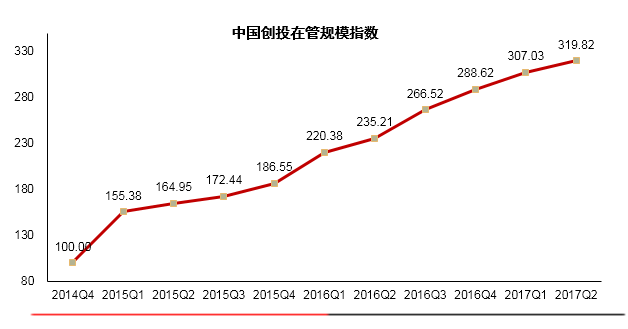 在管规模指数显示:在管规模指数与行业发展呈现正相关性。2015初至2017年上半年,在管规模呈现稳步上升趋势,指数从155.38上升至319.82,上涨幅度达1倍多,表明创投行业的蛋糕在快速不断做大。