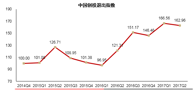 退出指数显示:受2015年投资大幅攀升与机构之间接盘因素影响,2015年Q2退出指数大幅上升至126.71。之后退出指数后呈下降趋势,于2016年Q1跌至96.95。2016年下半年IPO加速,退出指数迅速升至151.17。2017年Q1上半年指数达到166.56,创指数新高。2017年Q2指数小幅调整至162.96。