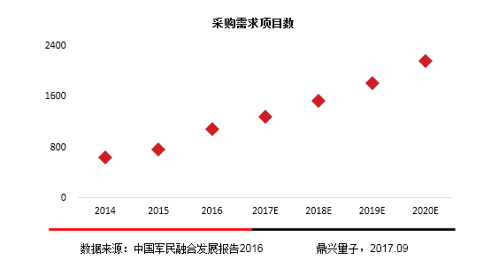 另外,从全军武器装备采购信息网发布的装备采购需求来看, 2017 年前三季度发布的项目信息数量高达990个,而 2016 年全年的项目信息仅为1081个,2015 年全年项目为767个,2014年从11月上线开始共发布643的项目信息,复合增长率达到18.91%。总体来看军备采购呈现明显增长趋势,预计到2020年将超过2000项。