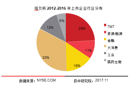 纽约证券交易所(简称“纽交所”,下同)是美国主要的专家做市商市场,也是美国最大的股票交易所。目前约有 2000 家上市公司的股票在纽交所交易,总市值达到了 29.5 万亿美元。首次上市纽交所的公司需要满足一系列条件才能加入,这些条件包括税前净利润限额、营业收入、公众持股市值和持股股东人数等要求(详情参见“2.2 上市条件对比”部分)。如某家上市公司业绩出现下降,无法符合上市条件则可能遭遇退市风险。总体而言,纽交所挂牌企业背后的投资者构成以长期投资者为主,如一些大型的共同基金、养老金、保险金这些大型的机构投资者。而个人投资者和对冲基金往往更加青睐于纳斯达克上市的企业。根据 2012 年-2016 年纽交所上市公司的统计,33%的上市企业为大消费类板块企业,其次是泛 TMT 行业企业和金融类企业,占整个上市企业数量的 24%和 15%。