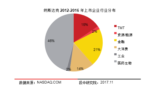 纳斯达克虽然在平均市值上小于纽交所,但在个股表现上更为突出。除以上提到的3家公司外,亚马逊(NASDAQ:AMZN)和脸书Facebook(NASDAQ:FB)也名列全美股市的市值前 5 名。而从近五年(2012 年至 2016 年)的上市公司行业来看,纳斯达克新晋上市公司集中于医药健康、金融、TMT 和大消费板块,其中医药生物企业占据了近 5 年上市企业的 46%,这一点和纳斯达克股市投资者青睐于新经济、新服务、新技术和新商业模式特征股票有关,医疗健康企业在纳斯达克挂牌上市能够得到较高的市盈率和市场回报。如 2016 年 4 月上市的精准医疗企业 Celator 制药有限公司的股价曾创下 16 天暴涨 7 倍的股价表现,其原因就在于该公司旗下的新药 VYXEOS 通过了三期临床验证,能显著提高急性髓系白血病高危患者总体存活率。这一重大突破无形中提高了 Celator 的技术壁垒,同时震惊了整个科学界和资本市场。随后该公司盘中紧急停牌,开盘后公司股价单日即暴涨 400%,从 1.68 美元的低位,最高涨至 13.9 美元。