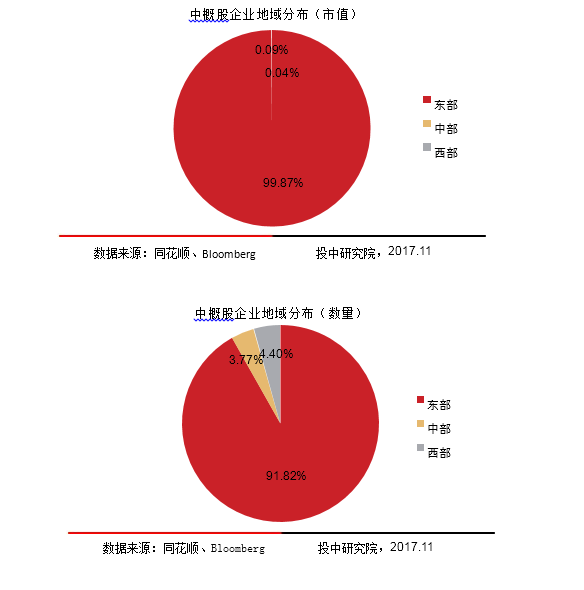 即大部分中概股均成立、运营于东部沿海地区。从数量上看,华北、华东和华南分别分布了 47%、26%和 18%的中概股企业,剩余地区(华中、西北及东北等)仅占全部美股中概股数量的 9%。而在市值方面,美股中概股的集中程度更加明显,近 60%的市值由华北地区的中概股企业创造,其次是华东地区占到了全部市值的 36%。美股中概股的这一特征和国内股票市场地域不平衡发展密切相关,根据投中统计的结果,A 股近 3000 家上市公司中,近一半以上的公司分布于广东、浙江、江苏、上海和北京五个省份,和中概股华南、华东和华北的集中程度相匹配。北京地区的上市公司总市值占整个 A 股市场的 28%,遥遥领先于其他省份,而中概股总市值占全部美股中概股的 58.5%,一方面既是北京的政治中心属性所致,另外也和央企集中的经济结构密切相关。